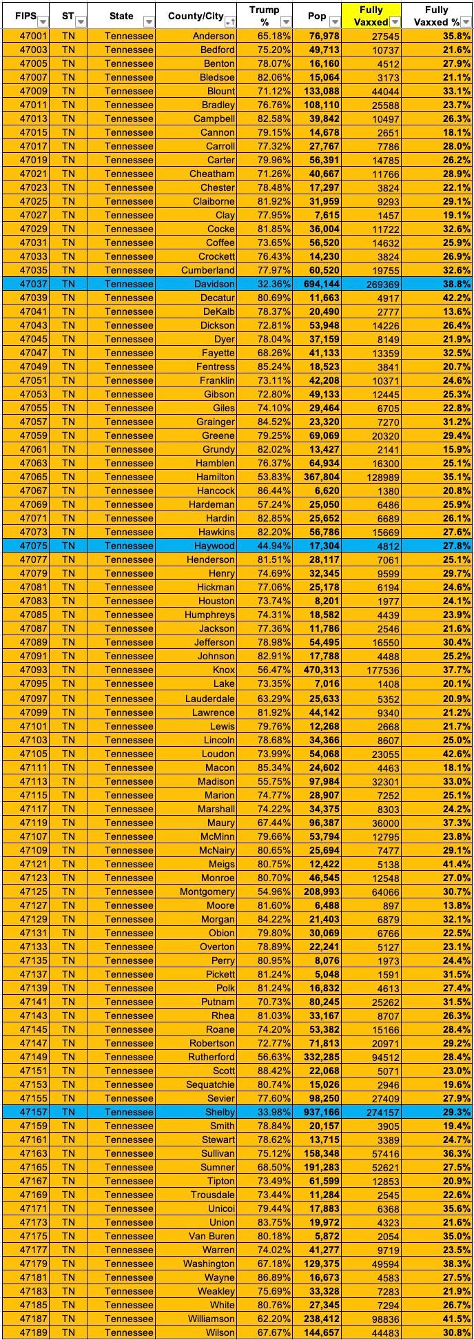 NOTE: The CDC lists ~49,000 Tennessee residents (2.3% of the total fully vaccinated) whose county of residence is unknown.