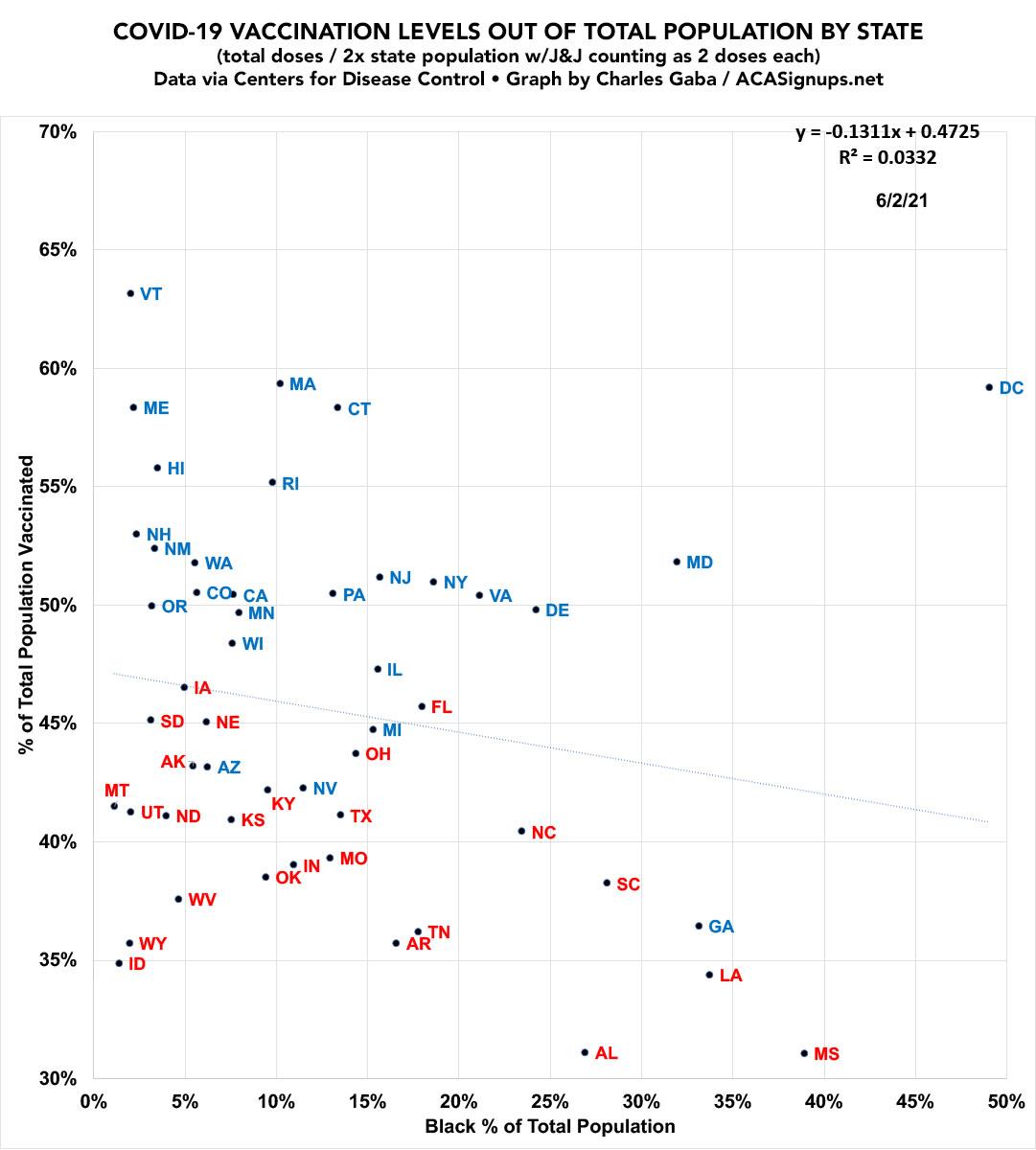 I've also plugged in a RACIAL DEMOGRAPHIC version based on the percent of each state's popualtion which is Black, according to 2018 Census Bureau estimates (by way of BlackDemographics.com). Obviously there's also Hispanic, Native American, Asian American/Pacific Islanders etc, but this illustrates things the most clearly: