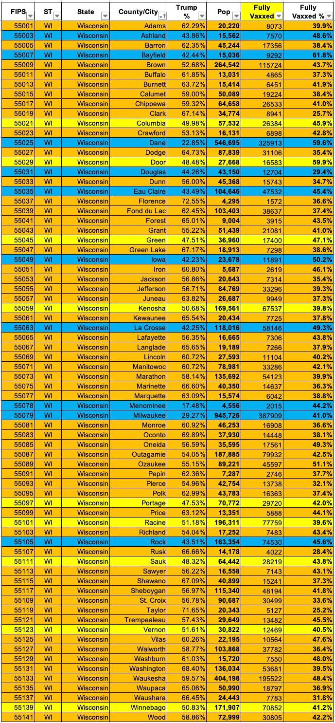 Wisconsin: #COVID19 vaccination rates by county & partisan lean
