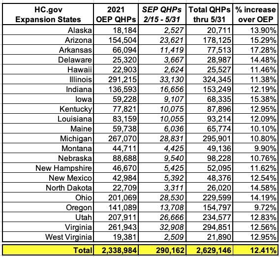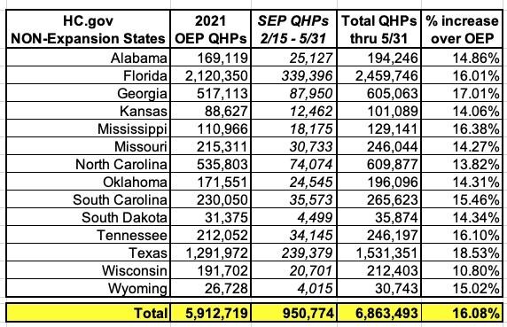 First, here's the NON-expansion states hosted on the federal exchange. I'm using the official 2021 Open Enrollment Period (OEP) totals to compare against. As you can see, if you add the just-confirmed SEP QHPs to these, the combined totals average around 16.1% higher.