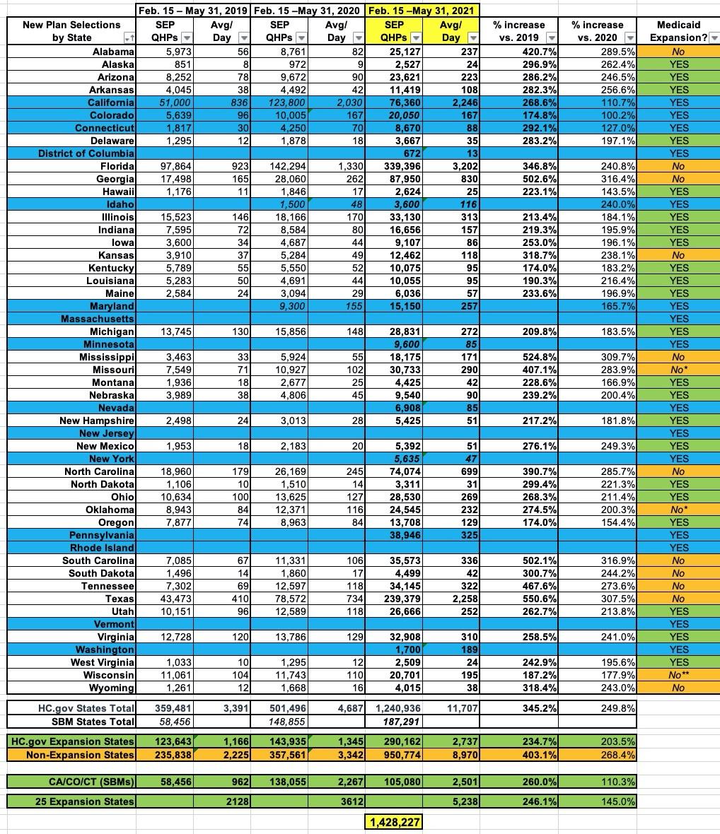 Meanwhile, here's an updated table showing how each state's SEP enrollment has increased over the same time period in 2019 and 2020. Keep in mind that the SBM states (in blue) are NOT based on 2/15 - 5/31 (106 days) but rather on anywhere from 9 - 120 days depending on the state; that's why I use per-day averages.