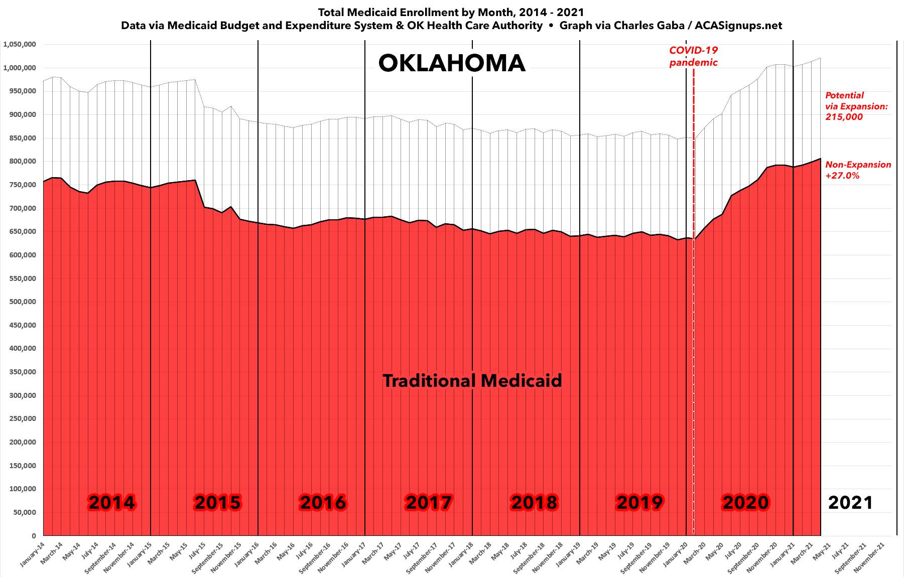 Oklahoma's non-ACA Medicaid enrollment slowly shrank from around 775,000 to 650,000 from 2014 - 2020...but since the COVID pandemic hit in early 2020, it's increased a whopping 27%.
