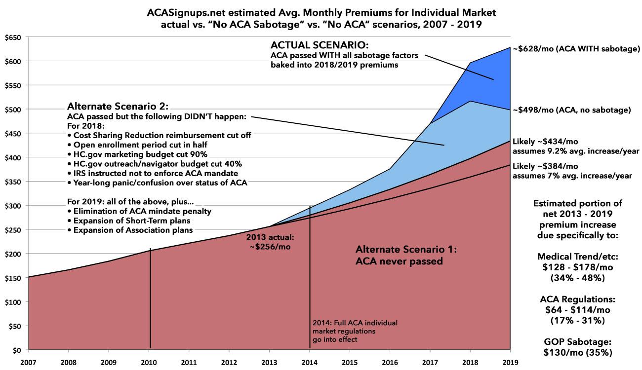 However, your "...driven by the law's broken regulations" jab is the definition of chutzpah, seeing how it was Congressional Republicans and Donald Trump who caused those premiums to increase by 17% this year and another 8% or so in 2019 by "breaking" two of the biggest provisions of the ACA: Cost Sharing Reduction reimbursements to insurance carriers and the individual mandate penalty.