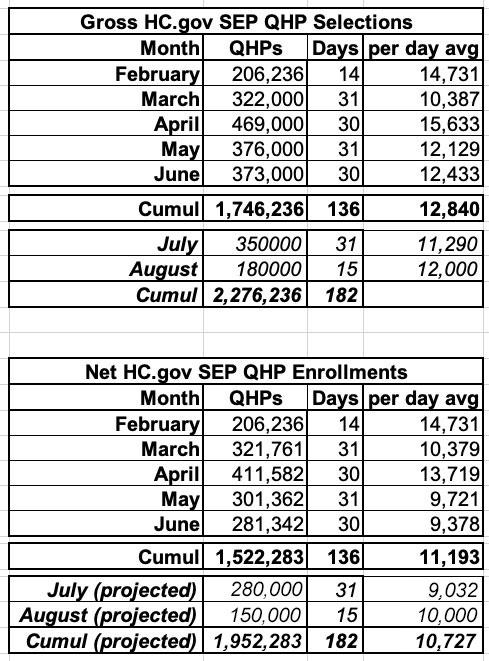 Here's how the SEP has gone for every month so far (note that this only includes HealthCare.Gov, not the ~600,000 who've enrolled via the other 15 state-based ACA exchanges). The first table is the gross Qualified Health Plan (QHP) selections; the second is the net enrollments after CMS removed those who never followed through by paying their first premium or who were never actually enrolled for other reasons: