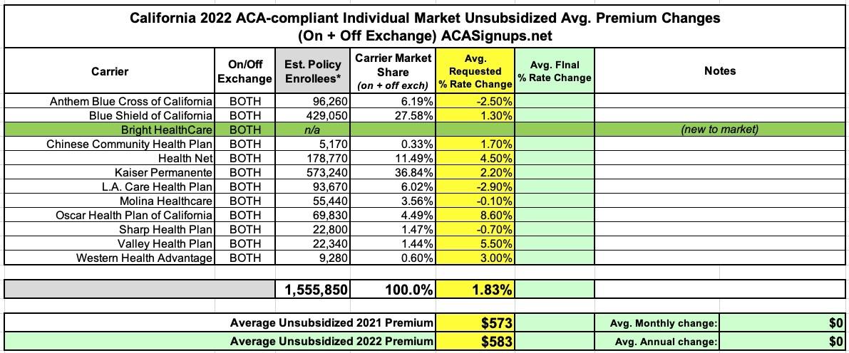 - The record enrollment and healthy consumer pool were key factors in negotiating a preliminary rate increase for California’s individual market of just 1.8 percent in 2022, and a three-year average of only 1.1 percent (2020-2022).