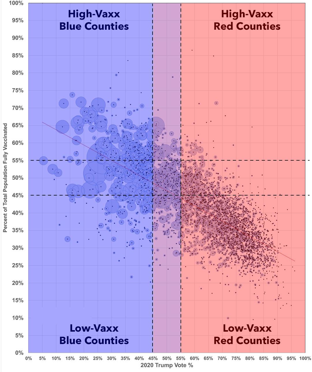 - 2,103 counties were "low-vaxx Red" (<45% vaxxed, > 55% Trump) as of 7/21