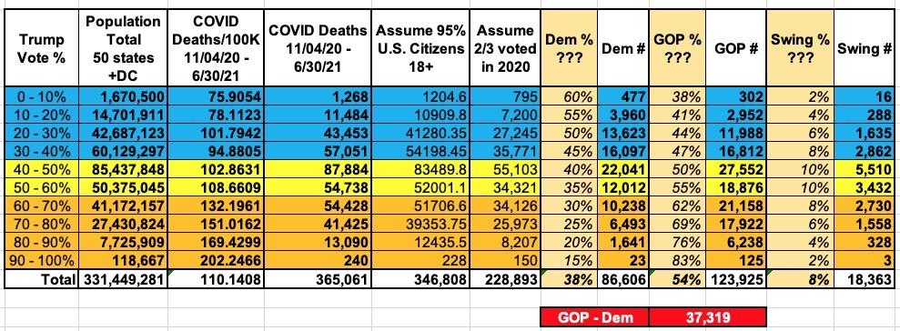 The grand total would then stand at somewhere around ~105,000 Democratic voters, ~220,000 Republican voters and ~26,000 swing voters having died nationally between 11/04/20 - 11/08/22...or a net loss of perhaps 115,000 more Republicans than Democrats overall.