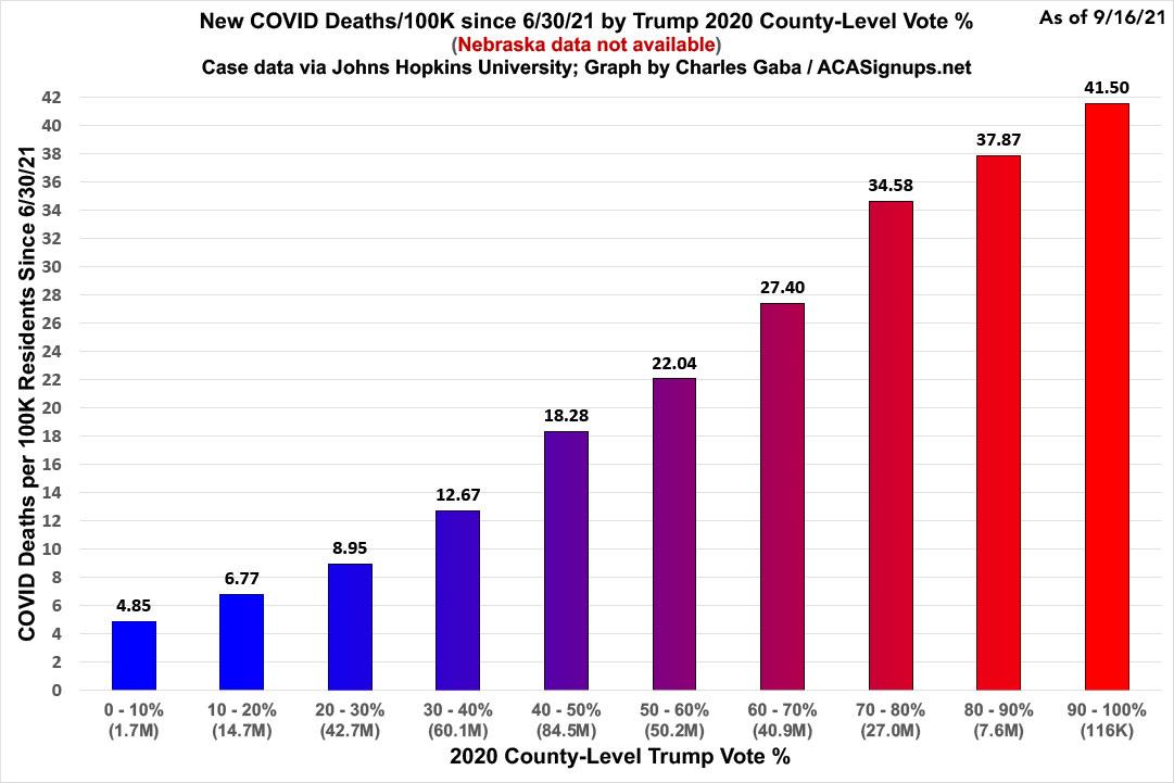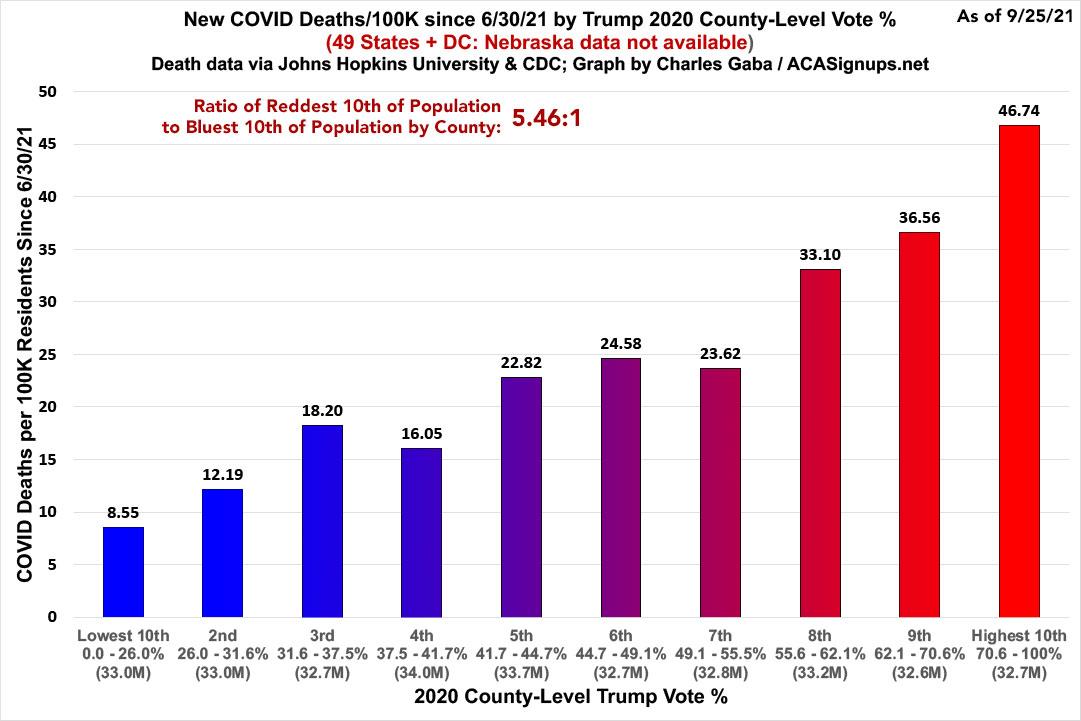 Again, while the highest bracket is 8.6x higher than the lowest one, it's more representative to use the 2nd & 8th brackets: The death rate in the reddest counties are around 5.6x higher than in the bluest counties since June 30th.