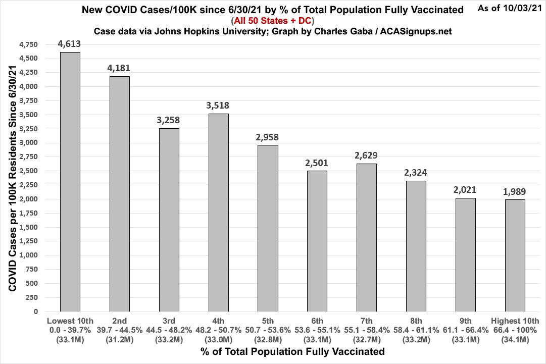 Finally, let's step back from the partisan angle for a moment and break the entire population out by vaccination rate to see whether that's reducing the COVID case and death rates: