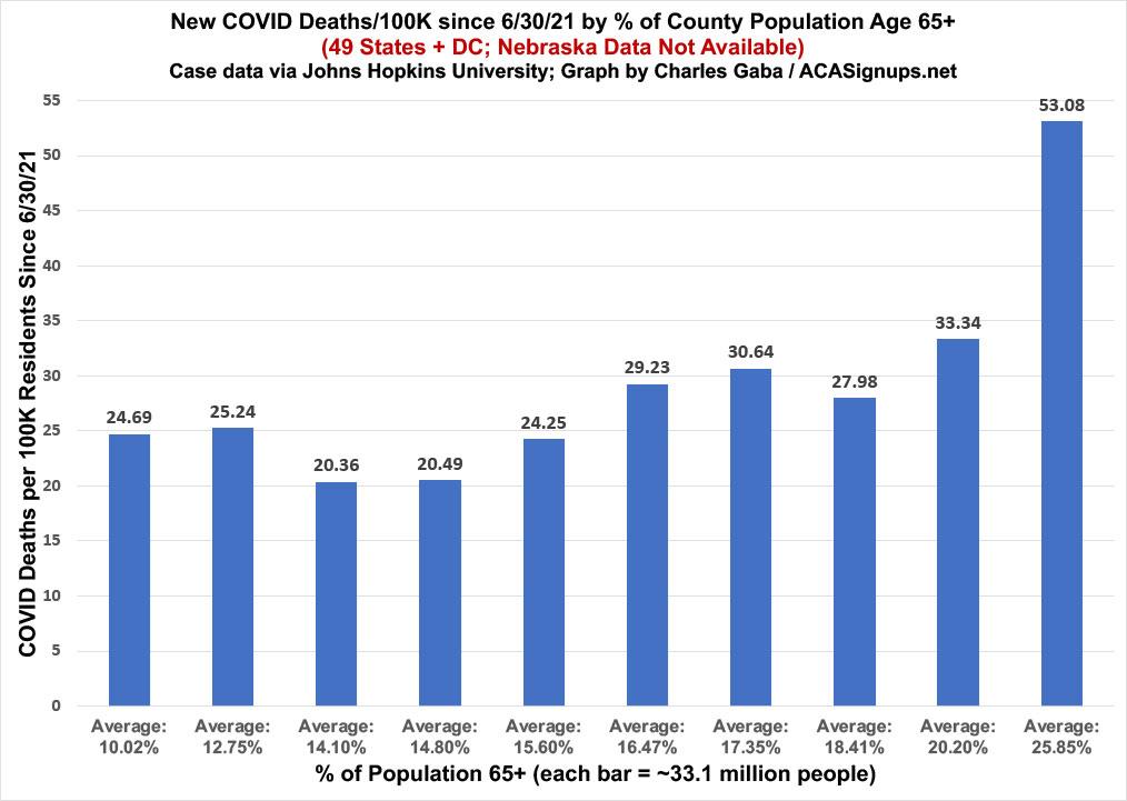 One of Beckham's biggest beefs with my "death rate" graph is that it doesn't adjust for age. Beckham feels this is extremely important because Republicans tend to be older than Democrats. Of course, if that's the case, using this same logic, red counties should be VACCINATED at a higher rate than blue counties as well. According to the CDC, fully 94.4%* 83.7%* of all senior citizens 65+ in the U.S. have been fully vaccinated as of today, versus just 64.9%* 56% of the population at large. This means that if you only include those under 65, only 50.5% of non-seniors are fully vaccinated in the U.S.