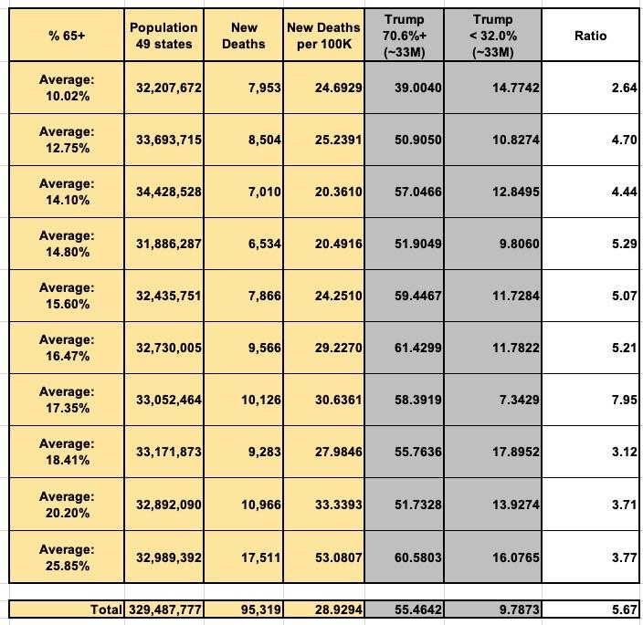 I decided to approach this issue in a slightly different way from either of them: I sorted out every county in the 50 U.S. states (+DC) by 2020 Trump vote based on what percent of their populations are 65 or older: