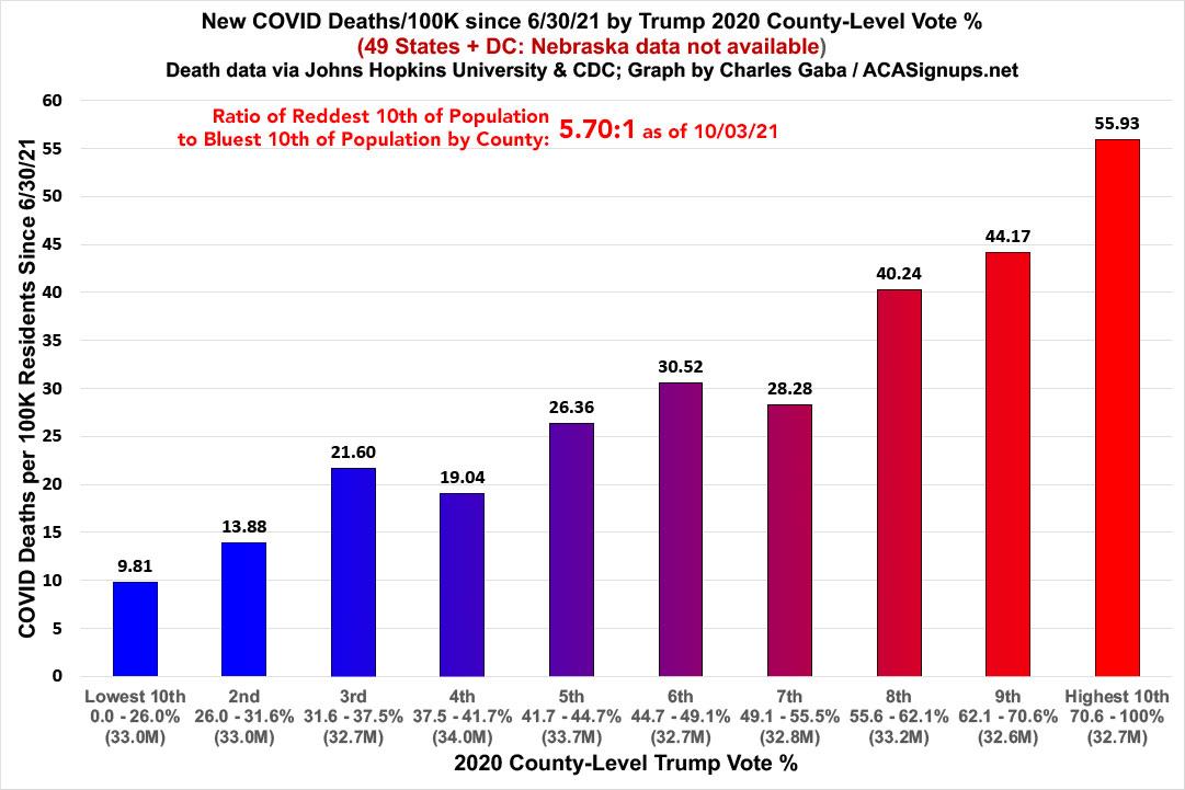 Since Delta began circulating widely in the U.S., Covid has exacted a horrific death toll on red America: In counties where Donald Trump received at least 70 percent of the vote, the virus has killed about 47 out of every 100,000 people since the end of June, according to Charles Gaba, a health care analyst. In counties where Trump won less than 32 percent of the vote, the number is about 10 out of 100,000.