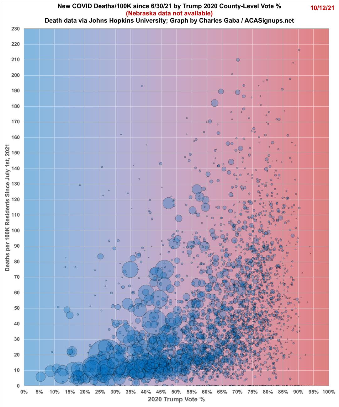 Since Delta began circulating widely in the U.S., Covid has exacted a horrific death toll on red America: In counties where Donald Trump received at least 70 percent of the vote, the virus has killed about 47 out of every 100,000 people since the end of June, according to Charles Gaba, a health care analyst. In counties where Trump won less than 32 percent of the vote, the number is about 10 out of 100,000.