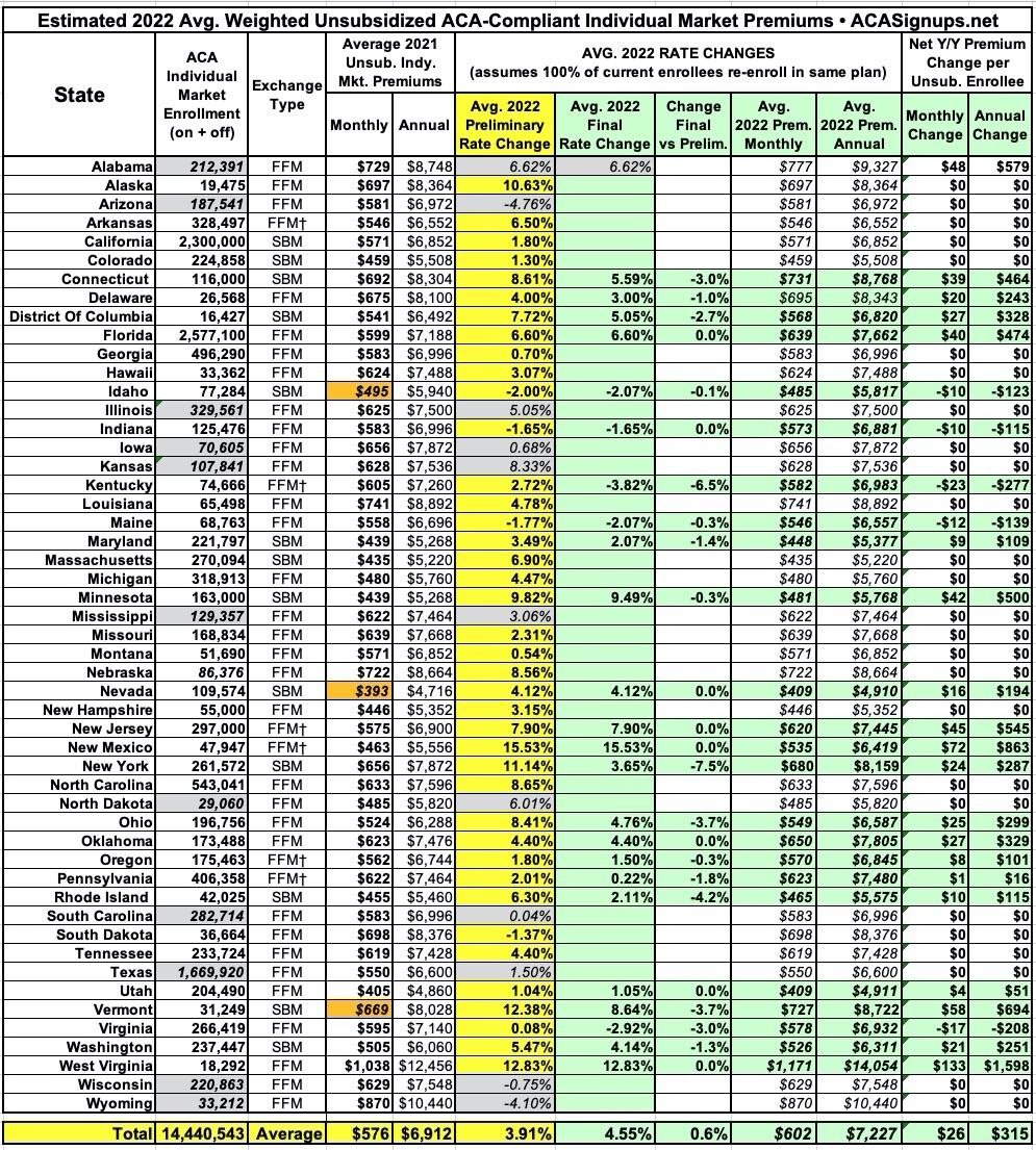 Again, I still have to fill in most of the final/approved statewide averages, but based on the requested/preliminary numbers, here's where things stand today. Keep in mind that all dollar amounts below assume UNSUBSIDIZED premiums. However, the vast majority of 2022 ACA exchange enrollees will be financially subsidized, bringing their net premiums down substantially; in fact, millions of them will pay no net premium at all, and none will have to pay any more than 8.5% of their household income for the benchmark Silver plan.