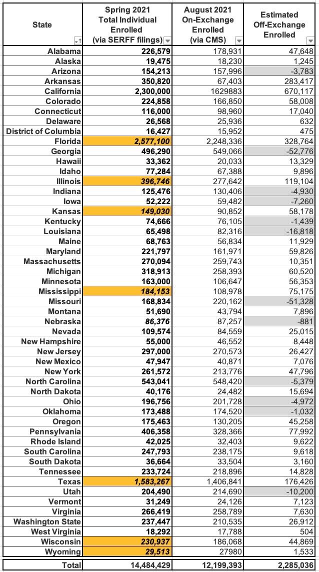 Assuming this is fairly accurate, it puts the total ACA-compliant individual market as of Summer 2021 at 15.2 million people, with 12.2 million on-exchange and around 3.0 million off-exchange nationally.