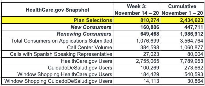 In week three of the 2022 Open Enrollment Period, approximately 810,000 people selected individual market plans through the 33 states that use the HealthCare.gov platform. During the Open Enrollment Period, to date, approximately 2,435,000 people have selected individual market plans on HealthCare.gov. As in past years, enrollment weeks are measured Sunday through Saturday.