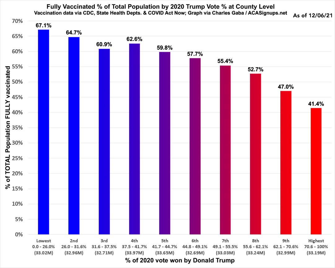 Here's what the data above looks like in bar graph format, broken out in rough deciles (tenths of the total population, or around 33.1 million people apiece). The vaccination rate in the bluest tenth of the nation is still running 62% higher than the reddest tenth: