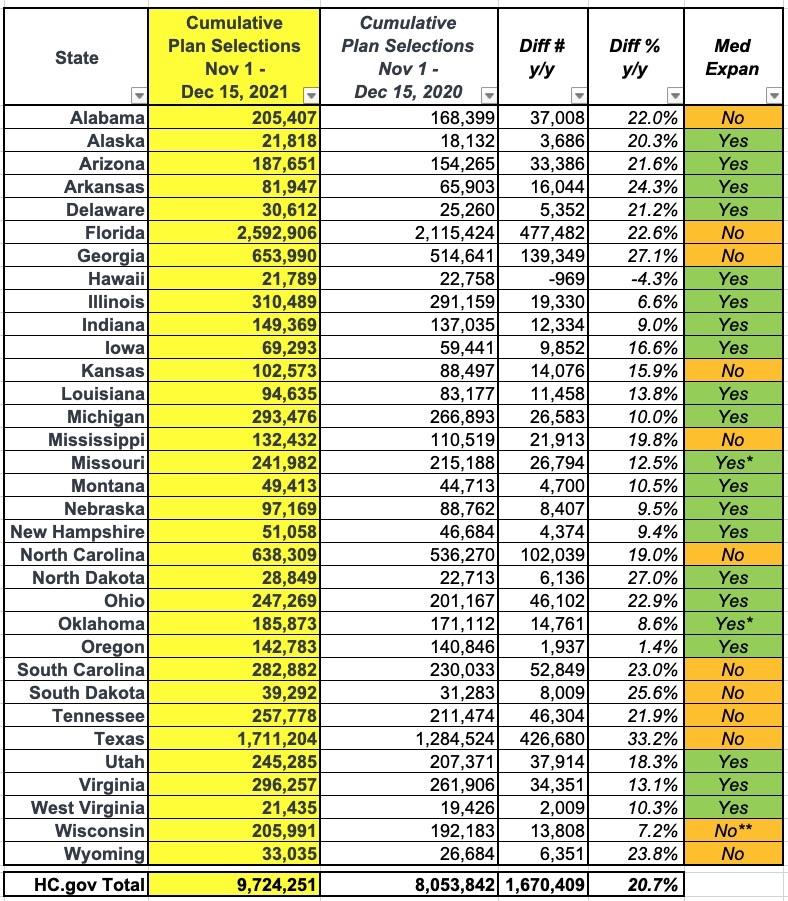HOWEVER, as noted above, KY, ME & NM all split off onto their own ACA platforms this year, which means they have to be subtracted from the 2021 OEP total That gives: