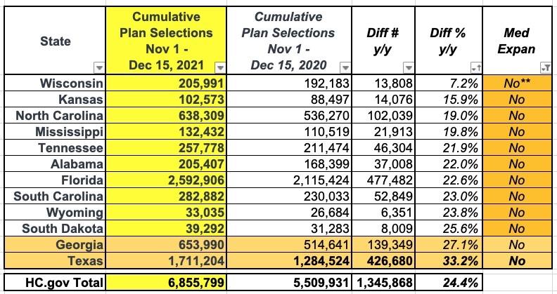 In fact, if you look at the non-expansion states alone, their enrollment to date is up 24.4% y/y (the expansion-only states via HC.gov are up 12.8% y/y):