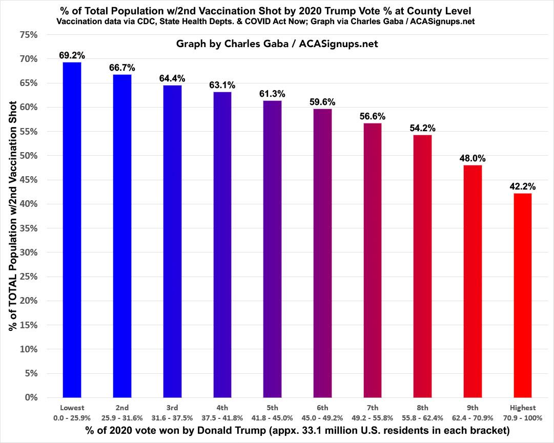 Here's what the data above looks like in bar graph format, broken out in rough deciles (tenths of the total population, or around 33.1 million people apiece). The vaccination rate in the bluest tenth of the nation is running 64% higher than the reddest tenth: