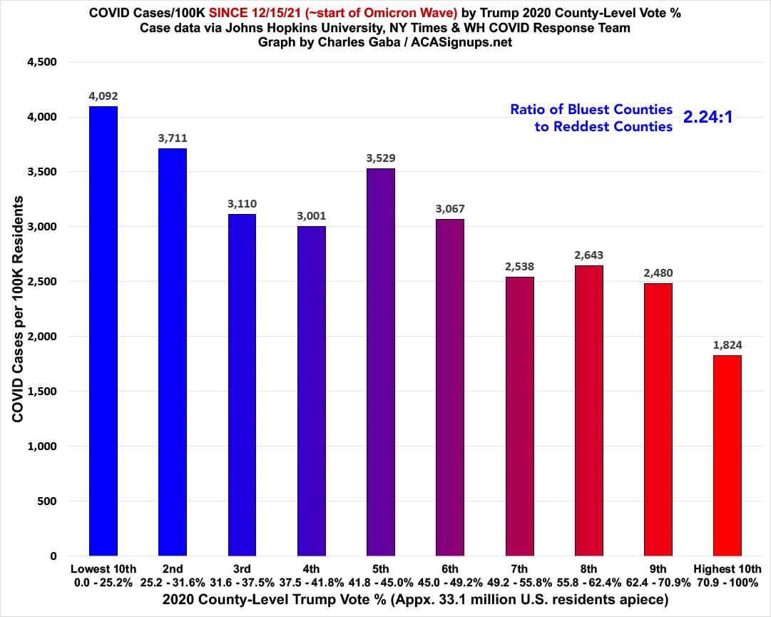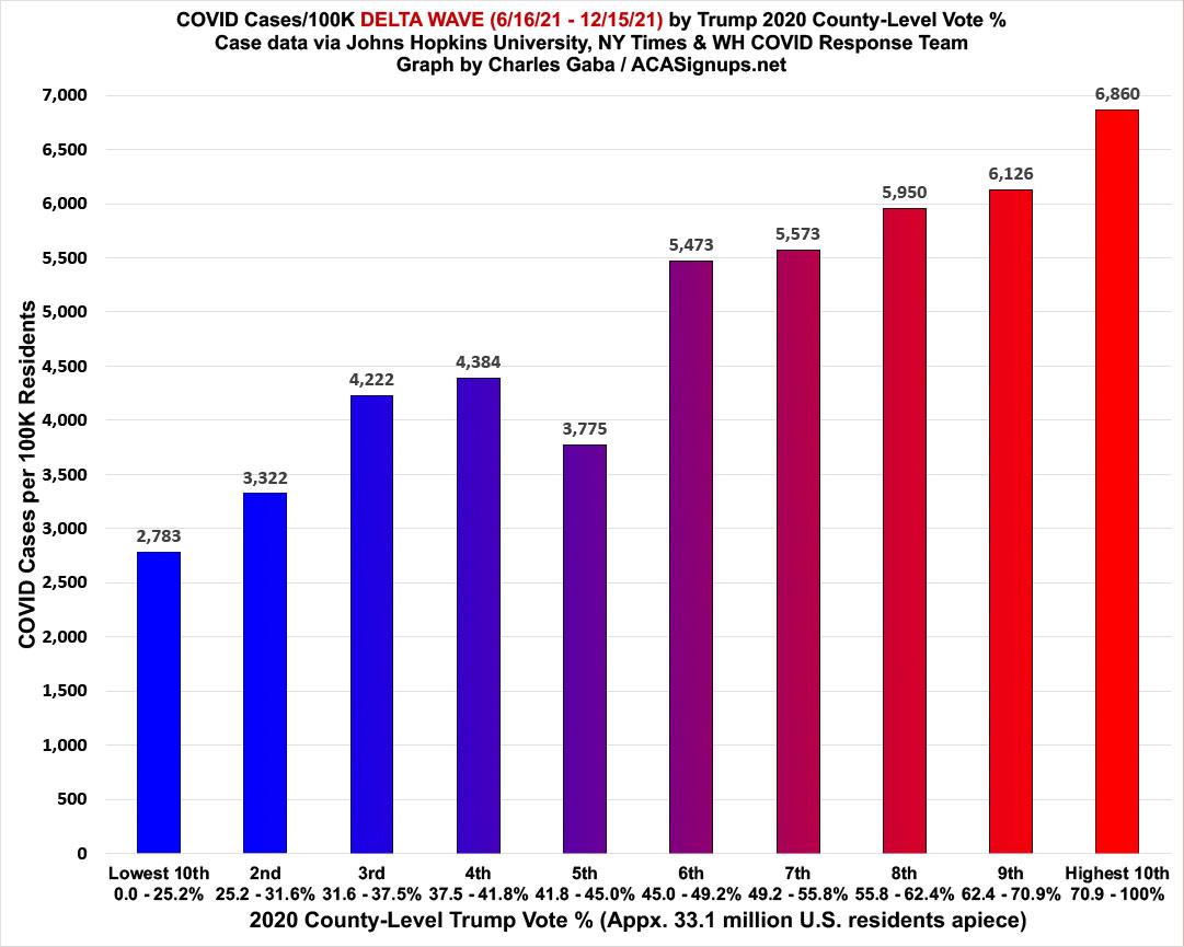FIRST, here's my final Delta wave graphs, which run from June 15th, 2021 - December 15, 2021. For that period of time, new COVID-19 case rates ran 2.46x higher in the reddest tenth of the U.S. than the bluest tenth...while COVID-19 death rates ran 5.77x higher: