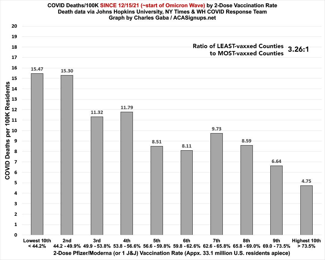 Here's the same data from a NONPARTISAN view: This is based purely on 2-dose vaccination rates (as of 12/15/21). Case rates in the least-vaccinated tenth of the U.S. ran 2.1x higher than in the most-vaccinated tenth, while death rates ran nearly 4.8x higher: