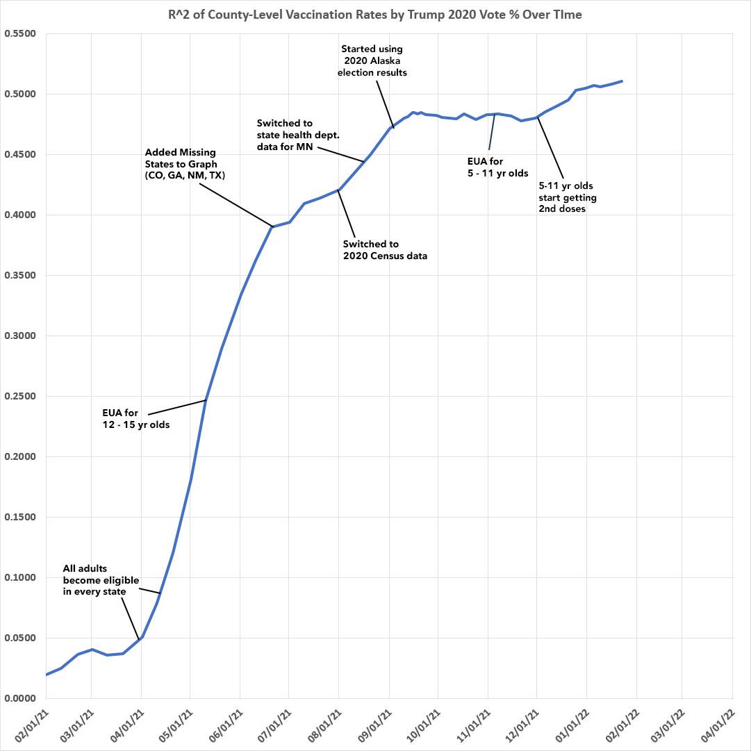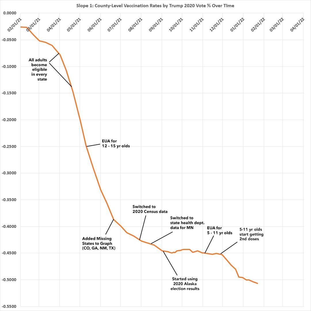 As I predicted back in mid-November, the most obvious reason for this is that 5 - 11 year-olds started receiving their 2nd Pfizer shot around Thanksgiving. The parents who were most likely to have gotten vaccinated themselves earlier this year are pretty clearly the ones most likely to get their children vaccinated, and the parents least likely to get vaccinated are, sadly, also those least likely to vaccinate their children either: