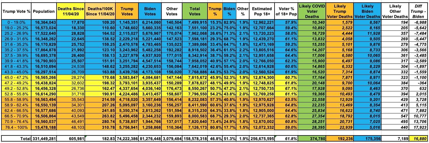 - The "Base Assumption" columns don't take anything into account other than the statewide election results and the post-11/04/20 election COVID death toll in each state. If you stopped there, there'd be nearly 6,000 more Biden voters than Trump voters who've died since the 2020 election...still an 11,000 swing from what a national popular vote count would give you.