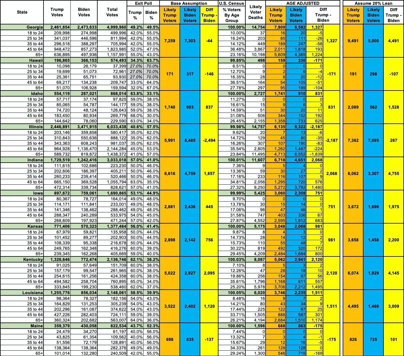 - The "Age Adjusted" columns are just that: Each state's voter turnout and COVID death toll has been broken out by age bracket and calculated accordingly, using the exit polls as noted. When you adjust for age, you end up with over 23,000 more Trump voters who've died since the 2020 election to date...a 40,000 swing from the popular vote expectation.