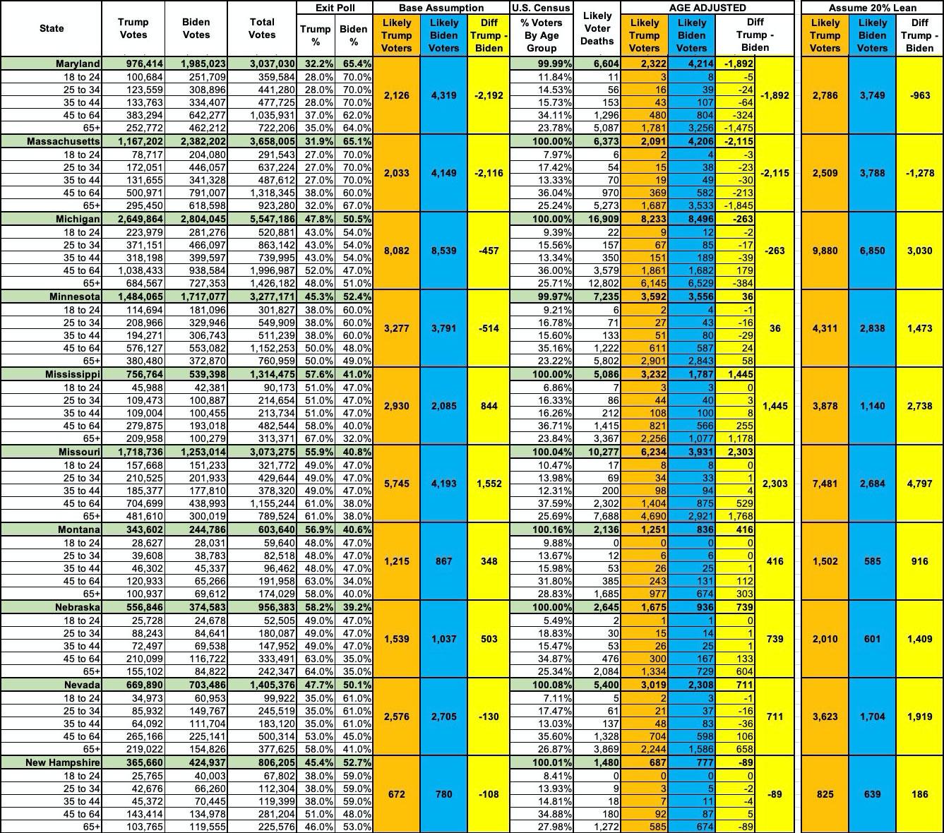 - Finally, the "Assume 20% Lean" columns attempt to account for the other factors I mentioned earlier: Misreported COVID deaths by MAGA coroners, the impact of refusal to wear masks/socially distance and so forth. Assuming this is reasonably accurate, it adds up to around 118,000 more Trump voters (roughly a 135,000 swing from popular vote expection).