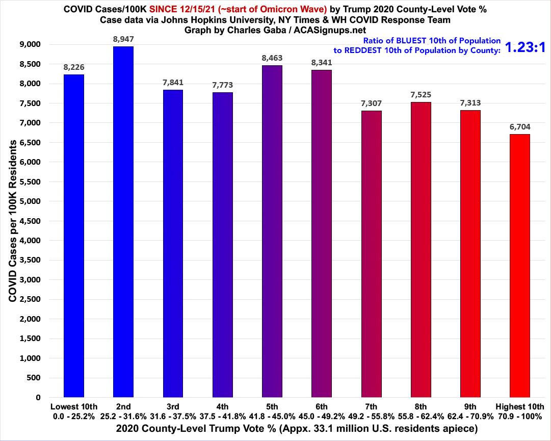 Death rates since Omicron started still swing red, as the death rate in the reddest decile is 1.74x higher than in the bluest. This is down from 2.9x higher a month earlier, however, and down from nearly 5.8x higher during the Delta wave. Remember, deaths tend to lag new cases by about 3 weeks, so it actually makes sense that the two would be shifting in opposite directions at the moment: