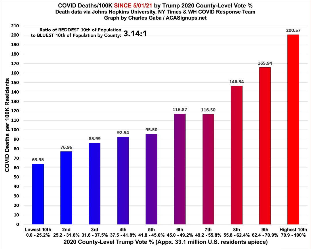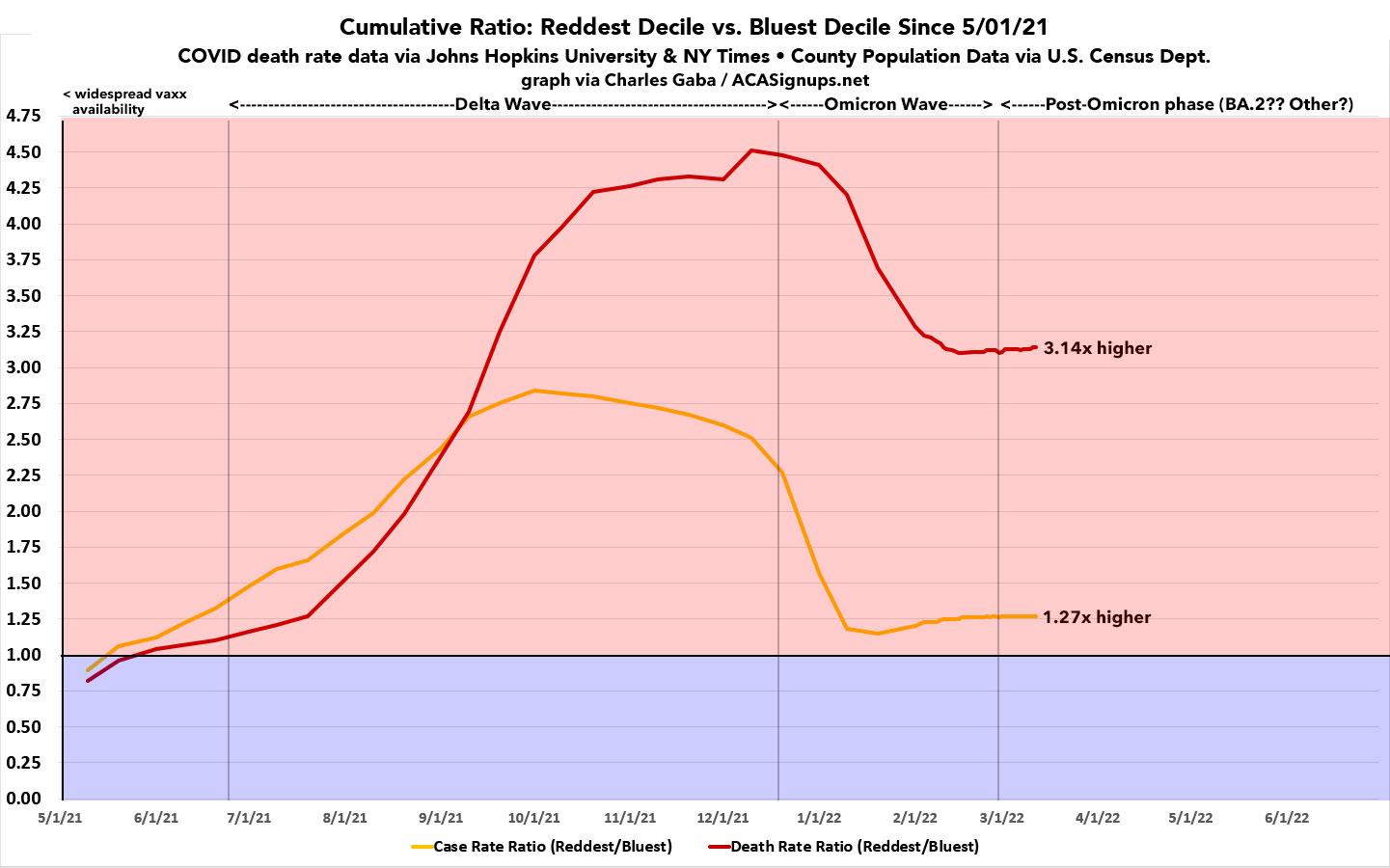 The graph below shows how the ratio of case and death rates in the reddest and bluest deciles have changed over time. The gap reached a peak of 4.5x higher at the height of the Delta wave last fall before dropping significantly during the Omicron wave...but since then it's stabilized and is even starting to inch back up again slowly: