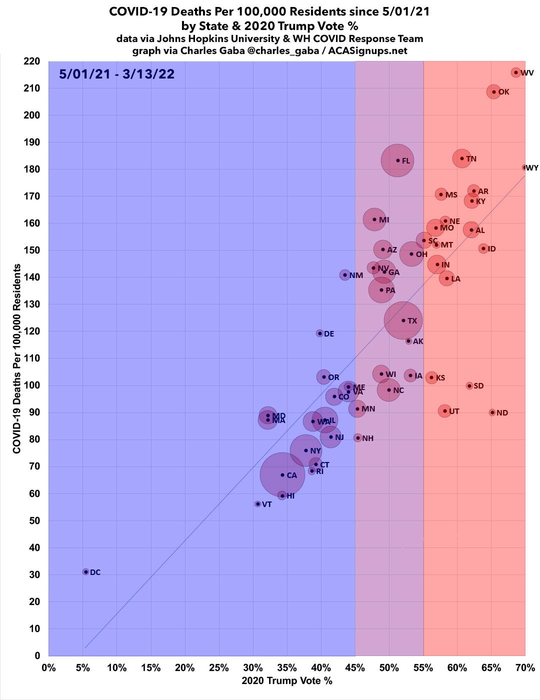 UPDATE: Dana Milbank cites several ACA Signups analyses (including this one) in a new column over at the Washington Post. He focuses heavily on Florida, and while some have speculated that Florida's death toll is higher because they have such a large number of senior citizens, this doesn't hold up when you dig deeper. For one thing, age was certainly a major factor in COVID deaths prior to vaccines becoming available, but since then seniors have been by far the most-vaccinated demographic in the U.S. for that very reason.