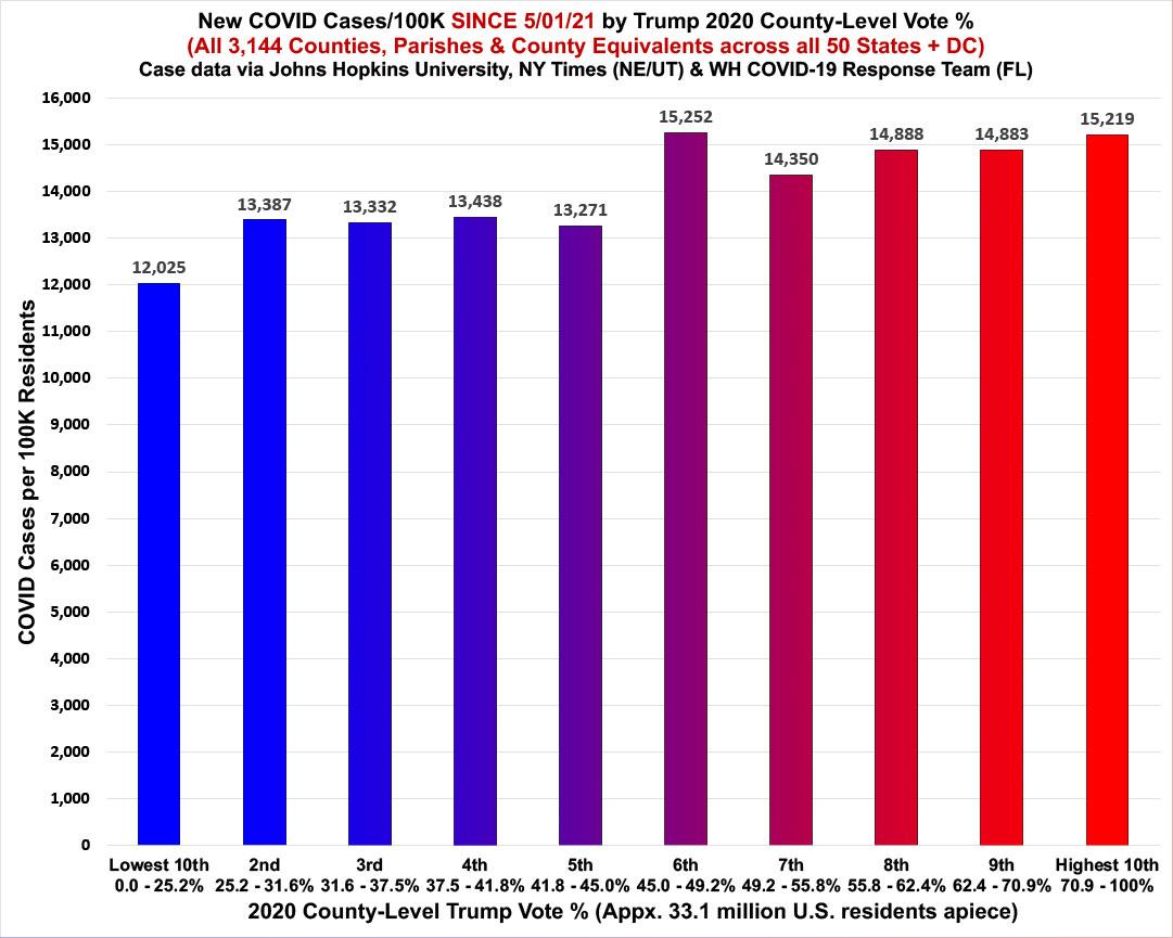 For months I posted weekly looks at the rate of COVID-19 cases & deaths at the county level since the end of June, broken out by partisan lean (i.e, what percent of the vote Donald Trump received in 2020), as well as by the vaccination rate of each county in the U.S. (nonpartisan). This basically amounts to the point when the Delta Variant wave hit the U.S., although it had been quietly spreading under the radar for a few months prior to that.