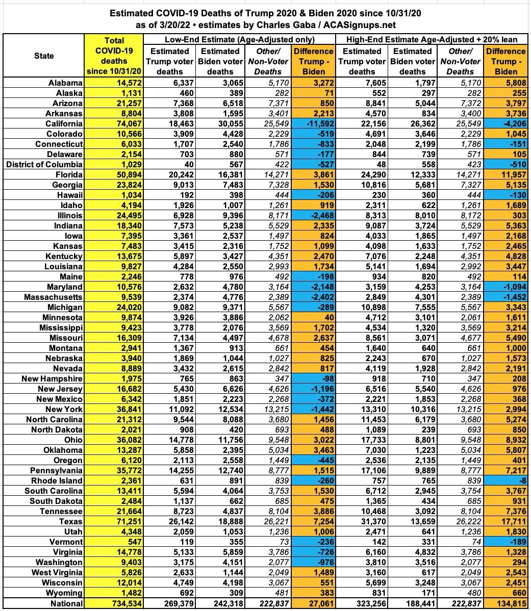 - The "Base Assumption" columns don't take anything into account other than the statewide election results and the post-11/04/20 election COVID death toll in each state. If you stopped there, there'd be 6,100 more Biden voters than Trump voters who've died since the 2020 election...still a 17,000 swing from what a simple national popular vote count would give you.
