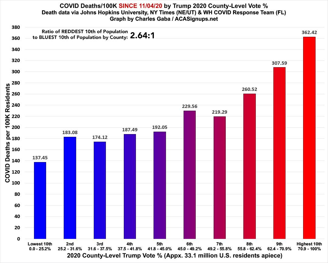 In fact, as of a few days ago, COVID deaths since the 2020 Election were running more than 2.6x higher in the reddest tenth of the country than the bluest tenth.