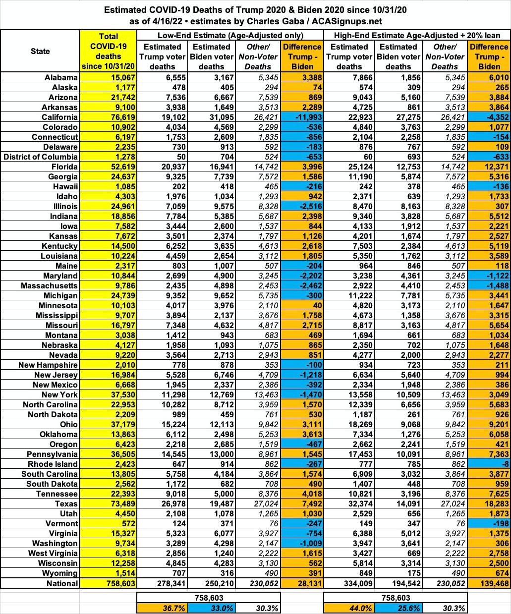 • The "Base Assumption" columns don't take anything into account other than the statewide election results and the post-11/04/20 election COVID death toll in each state. If you stopped there, there'd be 6,200 more Biden voters than Trump voters who've died since the 2020 election...still an 18,000 swing from what a simple national popular vote count would give you.