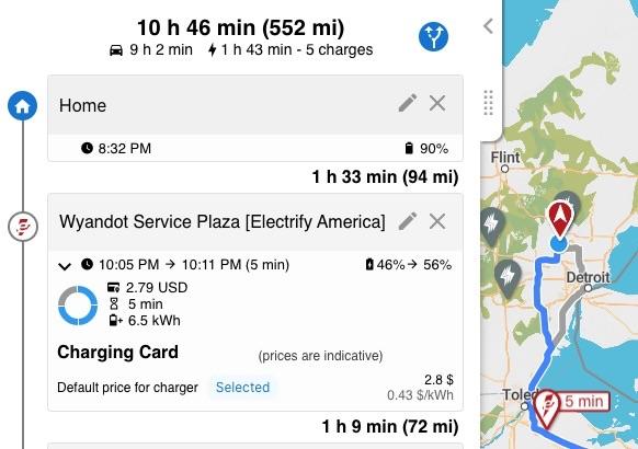 It also tells you how many miles & how long each driving stretch and charging session will be, how many charging stations there are at each location, how fast they charge at, what the estimated cost will be and so on. You can enter or modify what you want your starting and ending state of charge is and it will recalculate based on the changes.