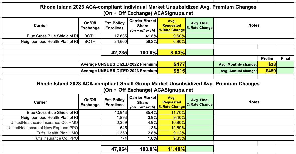 Rhode Island: (Preliminary) avg. 2023 unsubsidized #ACA rate changes: +8.0%