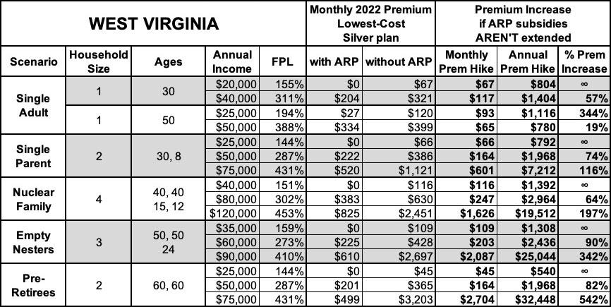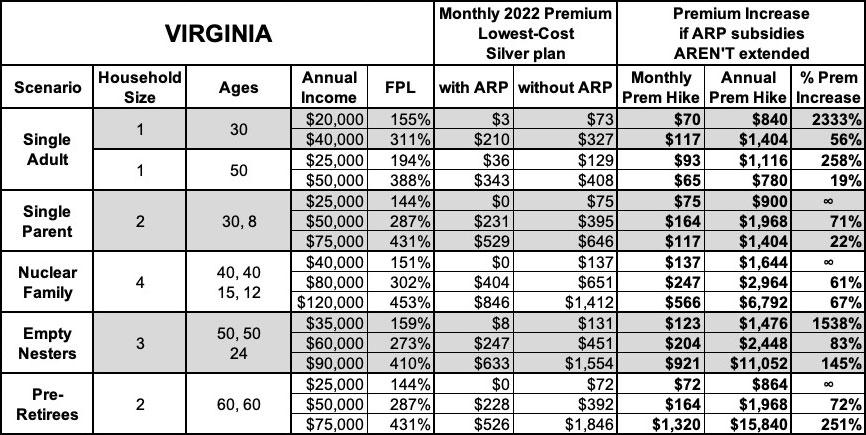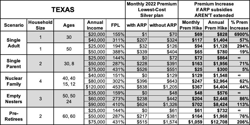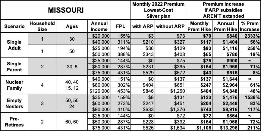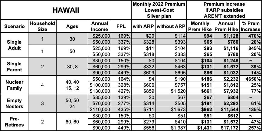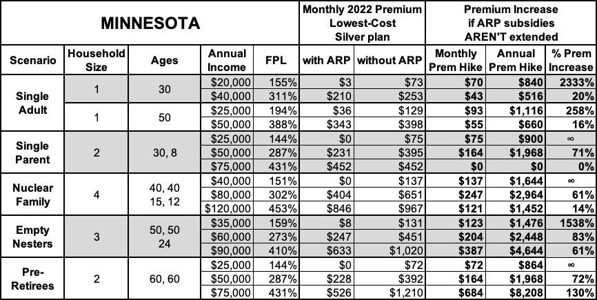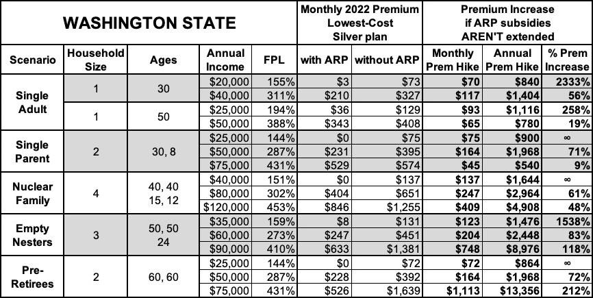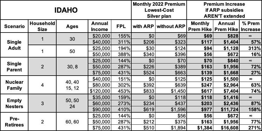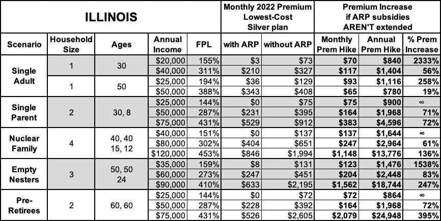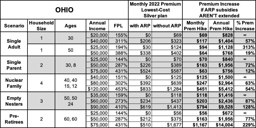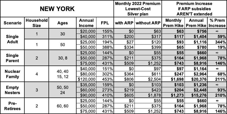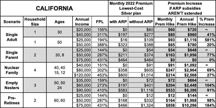 I concluded that, on average, the young adult would have to pay as much as $1,500 more per year; the middle-aged adult would have to pay up to $3,200 more; the family of four would have to pay up to $7,300 more; and the 60-year old couple could potentially be looking at as much as a jaw-dropping $17,000/year premium increase...again, assuming the expanded ARP subsidies aren't extended beyond December 31, 2022.
