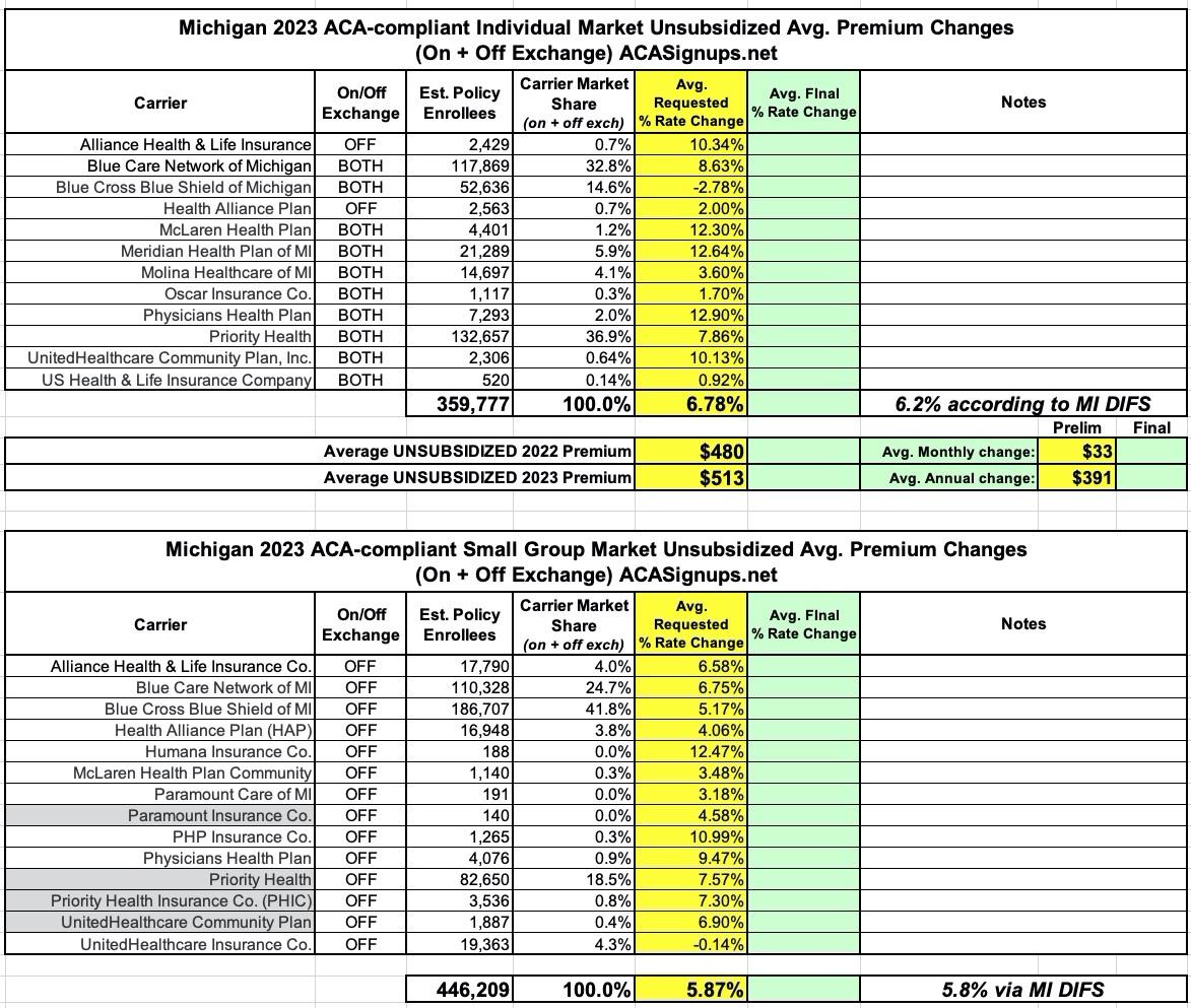 (updated) Michigan: (Preliminary) Avg. Unsubsidized 2023 #ACA Rate Change: +6.2%