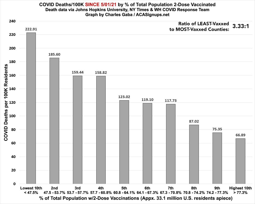 There's still a clear and dramatic correlation between how much of the population has been 2-dose vaccinated and its COVID death rate since last May. The least-vaccinated decile has a death rate ~3.3x higher than the most-vaccinated decile. It's important to note that this jumps around a bit from month to month since a few counties move from one decile bracket to the other as vaccination data is bulk-updated: