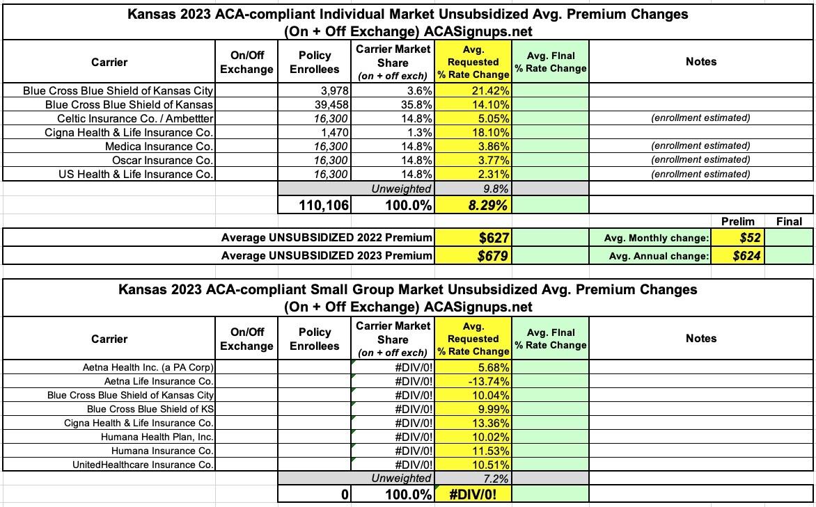 Kansas: (Preliminary) semi-weighted avg. unsubsidized 2023 #ACA rate changes: +8.3%