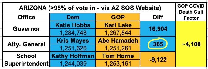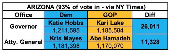 That leaves just Arizona Governor and Arizona Attorney General, where Democrats are down to a 26,000 and 11,300 vote winning margin respectively. Again, if either of these end up with the Democrats winning by less than around ~4,100 votes, there you go: