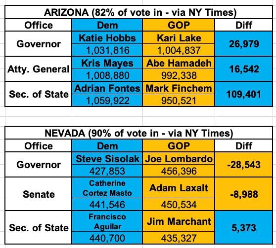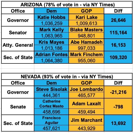 UPDATE 9pm Sunday: Well, most of the races above have been called now; Mark Kelly & Adrian Fontes have won AZ-Senate & AZ-SOS handily, while in Nevada, Gov. Sisolak lost, Francisco Aguilar won by more than the "death cult" margin and it looks like Catherine Cortez Masto did as well, although hers is by far the closest of these (it looks like she ended up winning by perhaps 5,000 votes or so).