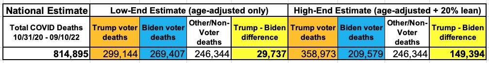 Instead, however, I estimated that nationally, perhaps ~150,000 more Americans who voted for TRUMP in 2020 had died of COVID-19 between the 2020 general election and the 2022 midterm election than those who voted for Biden.