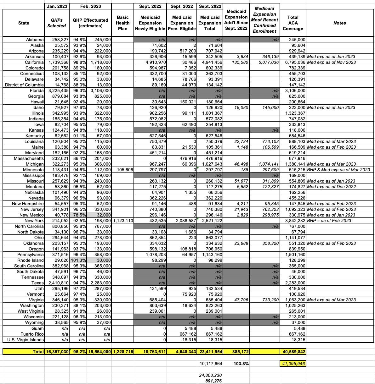 I concluded that the total numbers for each were roughly 15.4 million QHPs, 1.2 million BHPs and 23.5 million Medicaid expansion enrollees, or around 40.1 million people total.