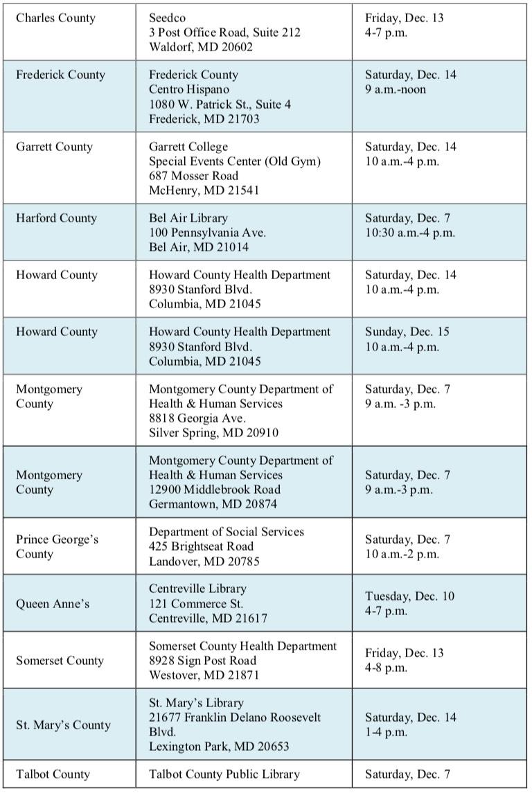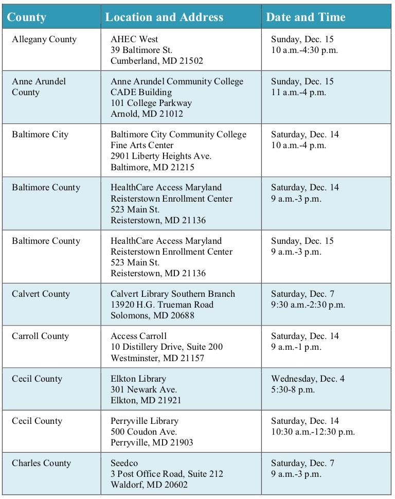 Maryland Health Connection will hold nearly 20 “Last Chance” events throughout the state during the final week of open enrollment Dec. 7-15 to provide free help enrolling in health coverage. Marylanders can enroll in health and dental coverage until Dec. 15 through Maryland Health Connection, the state’s health insurance marketplace.
