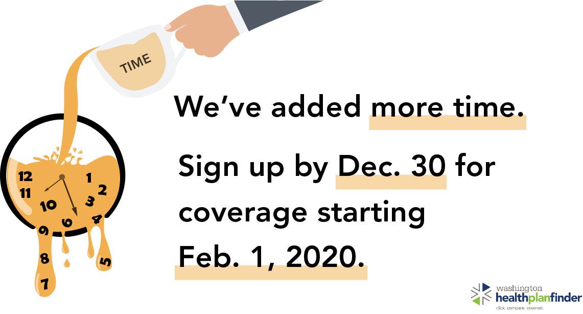 Enroll in a plan from now through Dec. 30 at 8pm to receive coverage starting Feb. 1, 2020. #GetCoveredWA