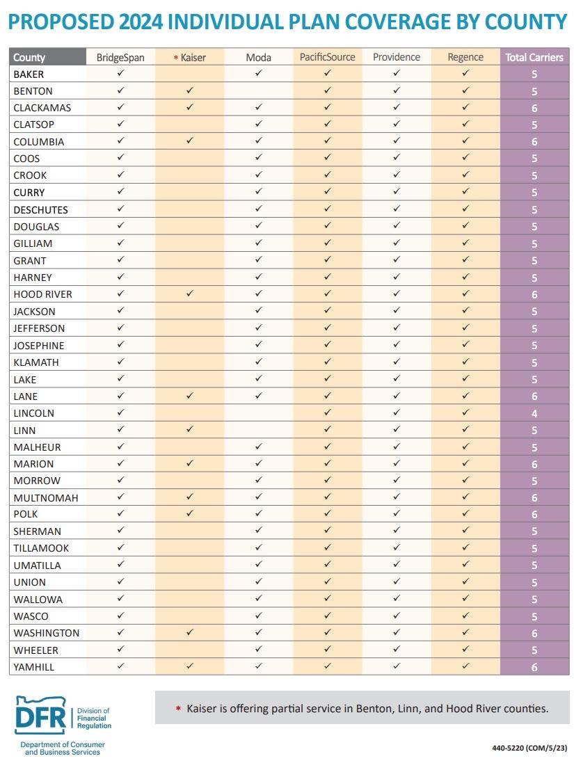 The requested rates are for plans that comply with the Affordable Care Act for small businesses and individuals who buy their own coverage rather than getting it through an employer. For the second year in a row, every county has at least four companies available for people to buy insurance on the individual market. Deschutes County, which has four companies in 2023, is proposed to have five in 2024.